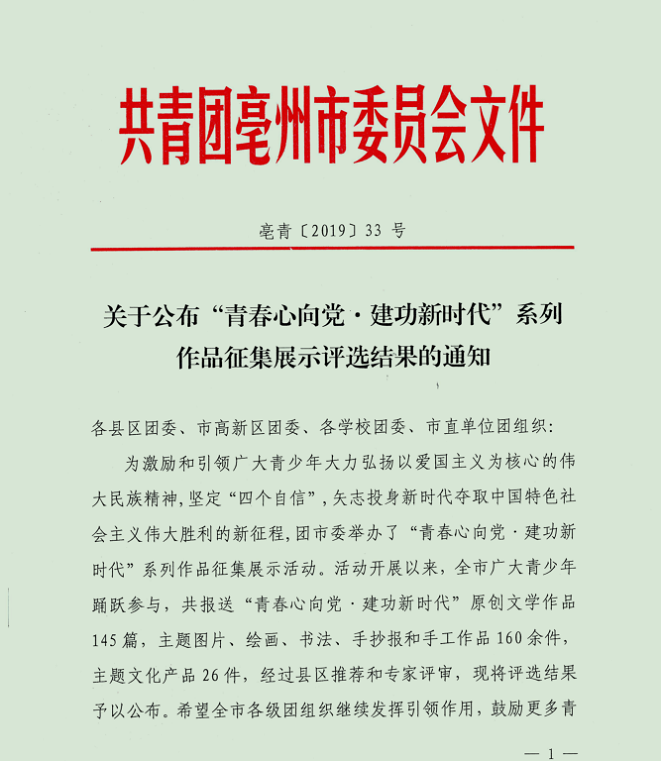 在團市委“青春心向黨建功新時代”系列作品征集中,集團高度重視、積極動員、精心組織,向集團各部室、子公司印發(fā)了作品征集通知。廣大青年積極參與,紛紛以詩歌、散文、書法、主題圖片等形式,表達對祖國的熱愛,對青春建功的熱切期盼,積極弘揚青春正能量和愛國主義主旋律。經(jīng)內(nèi)部審核、優(yōu)中選優(yōu),集團團委共推薦各類作品10余件,本次評選中有6件作品獲獎;集團團委在此次活動中的組織工作也得到了主辦方認可,獲評團市委授予的“優(yōu)秀組織獎”。