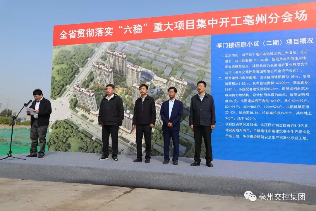 10月28日上午,市貫徹落實“六穩(wěn)”重大項目集中開工儀式在譙城區(qū)李門樓還原小區(qū)項目現(xiàn)場舉行。市委常委、常務(wù)副市長李軍,市政府副秘書長劉巖,市直有關(guān)單位主要負責(zé)人,各縣區(qū)政府分管負責(zé)人,集團黨委副書記、總經(jīng)理劉超,財務(wù)總監(jiān)董雷出席開工儀式。