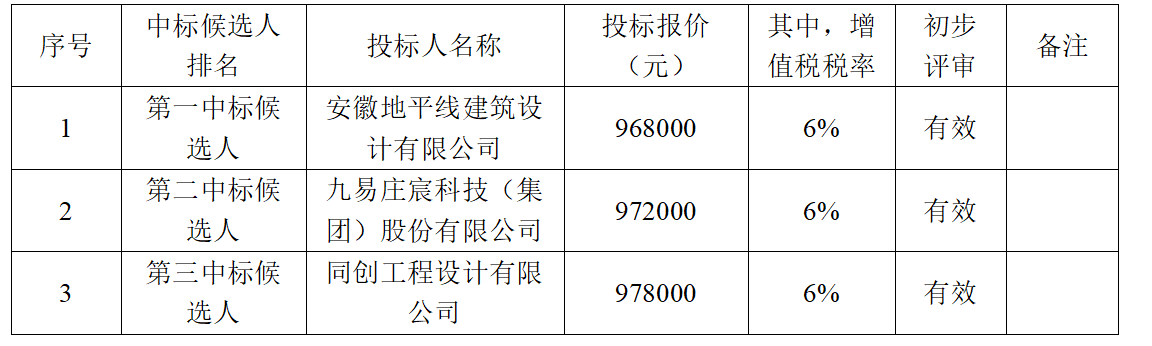 經(jīng)招標(biāo)人研究,確定安徽地平線建筑設(shè)計有限公司為中標(biāo)人,中標(biāo)價(大寫)玖拾陸萬捌仟元整,(小寫)968000元,其中增值稅稅率為6%。