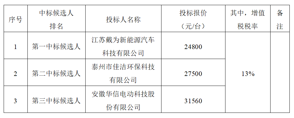 根據(jù)有關(guān)規(guī)定,招標(biāo)人確定江蘇戴為新能源汽車科技有限公司為中標(biāo)人,中標(biāo)價(jià)(大寫)貳萬(wàn)肆仟捌佰元每臺(tái),(小寫)24800元/臺(tái),采購(gòu)數(shù)量16臺(tái),交貨期:自收到中標(biāo)通知書之日起5日歷天內(nèi)完成供貨,交貨地點(diǎn):亳州市內(nèi),招標(biāo)人指定地點(diǎn),完成本項(xiàng)目投標(biāo)設(shè)備的供貨、運(yùn)輸、裝卸、調(diào)試、售后服務(wù)等工作。