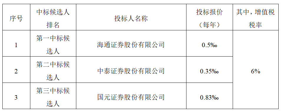 根據(jù)有關(guān)規(guī)定,招標(biāo)人確定海通證券股份有限公司為中標(biāo)人,中標(biāo)價(jià)為以本期非公開發(fā)行公司債券最終實(shí)際發(fā)行金額為基準(zhǔn),基準(zhǔn)價(jià)的0.5‰每年,發(fā)行期限不超過3年,承銷方式余額包銷,完成本項(xiàng)目主承銷工作。