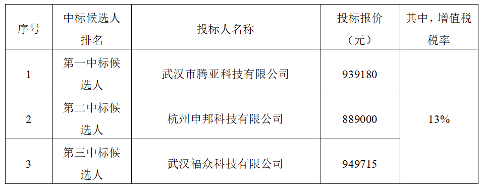根據(jù)有關(guān)規(guī)定,招標(biāo)人確定武漢市騰亞科技有限公司為中標(biāo)人,中標(biāo)價為人民幣(大寫)玖拾叁萬玖仟壹佰捌拾元,人民幣(小寫)939180元,按合同約定完成本項目投標(biāo)產(chǎn)品的供貨、運輸、裝卸、調(diào)試、售后服務(wù)以及配套設(shè)施建設(shè)等工作。