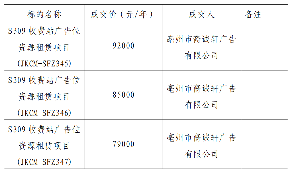 亳州S309收費(fèi)站廣告位資源租賃項(xiàng)目(項(xiàng)目編號(hào):TX-2022-02號(hào))于2022年4月22日9時(shí)00分進(jìn)行公開競(jìng)價(jià),現(xiàn)競(jìng)價(jià)工作已結(jié)束,并經(jīng)采購(gòu)人確認(rèn),將競(jìng)價(jià)結(jié)果公示如下:
