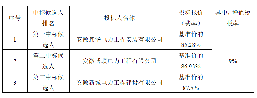 根據有關規(guī)定,招標人確定安徽鑫華電力工程安裝有限公司為中標人,中標價為以工程造價咨詢機構編制的招標控制價為基準,基準價的85.28%(其中,增值稅稅率為9%),工期60日歷天,按合同約定實施和完成承包工程,修補工程中的任何缺陷,工程質量符合國家、地方、行業(yè)現(xiàn)行相關規(guī)范合格標準,符合設計圖紙、圖集規(guī)定標準,通過供電主管部門驗收,滿足招標文件第五章技術標準和要求。