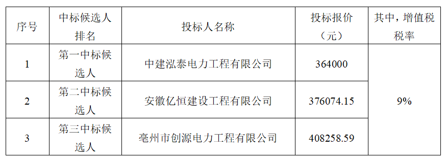 根據(jù)有關(guān)規(guī)定,招標(biāo)人確定中建泓泰電力工程有限公司為中標(biāo)人,中標(biāo)價(jià)為人民幣(大寫(xiě))叁拾陸萬(wàn)肆仟元整,(小寫(xiě))364000元(其中,增值稅稅率為9%),工期30日歷天,按合同約定實(shí)施和完成承包工程,修補(bǔ)工程中的任何缺陷,工程質(zhì)量符合國(guó)家、地方、行業(yè)現(xiàn)行相關(guān)規(guī)范合格標(biāo)準(zhǔn),符合設(shè)計(jì)圖紙、圖集規(guī)定標(biāo)準(zhǔn),通過(guò)供電主管部門(mén)驗(yàn)收,滿足招標(biāo)文件第五章技術(shù)標(biāo)準(zhǔn)和要求。