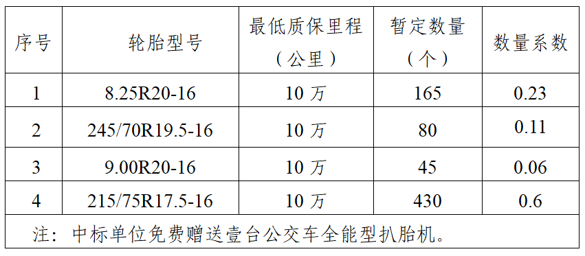 (二)采購(gòu)內(nèi)容:本次招標(biāo)輪胎均為原廠鋼絲輪胎(公交或客運(yùn)專用)