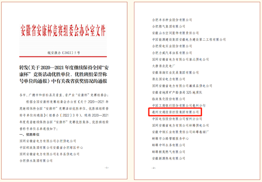 近日,根據(jù)全國(guó)“安康杯”競(jìng)賽組委會(huì)《關(guān)于2020-2021年度繼續(xù)保持全國(guó)“安康杯”競(jìng)賽活動(dòng)優(yōu)勝單位、優(yōu)勝班組榮譽(yù)稱(chēng)號(hào)單位的通報(bào)》,交控集團(tuán)順利通過(guò)復(fù)評(píng),繼續(xù)保持全國(guó)“安康杯”競(jìng)賽優(yōu)勝單位榮譽(yù)稱(chēng)號(hào),這是交控集團(tuán)連續(xù)兩次獲此殊榮!