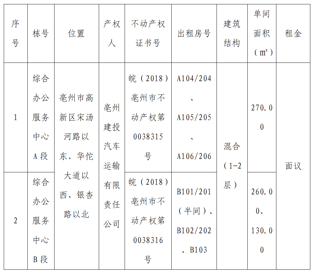 本招租項目為亳州建投汽車運輸有限責(zé)任公司綜合辦公服務(wù)中心剩余臨街商鋪,招租人為亳州建投汽車運輸有限責(zé)任公司,現(xiàn)對該項目進(jìn)行公開招租。