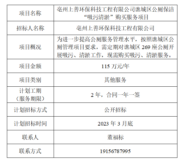 為便于潛在投標人及時了解招標信息,現(xiàn)將亳州上善環(huán)??萍脊こ逃邢薰?招標人名稱)的招標計劃發(fā)布如下: