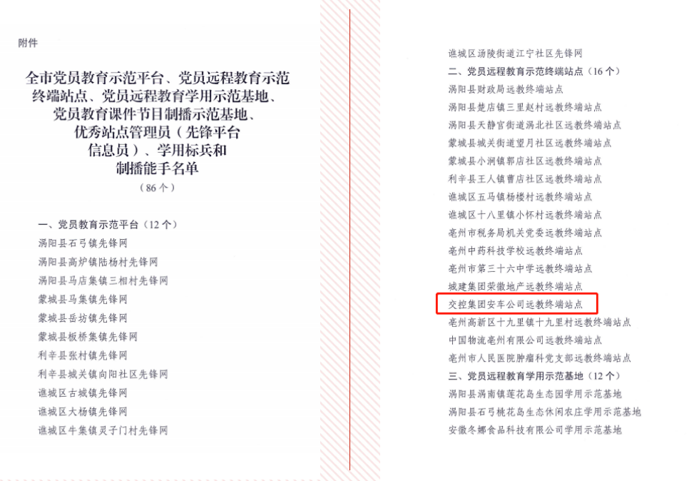 近日,中共亳州市委組織部印發(fā)了《關(guān)于全市黨員電教遠教“雙創(chuàng)雙爭”活動評選結(jié)果的通報》(組通字﹝2023﹞2號)和《關(guān)于命名全市第六批“五星基層黨組織”“五星遠教站點”的通報》(組通字﹝2023﹞3號)文件,安車交通黨支部榮獲“黨員遠程教育示范終端站點”和全市第六批“五星基層黨組織”榮譽稱號。