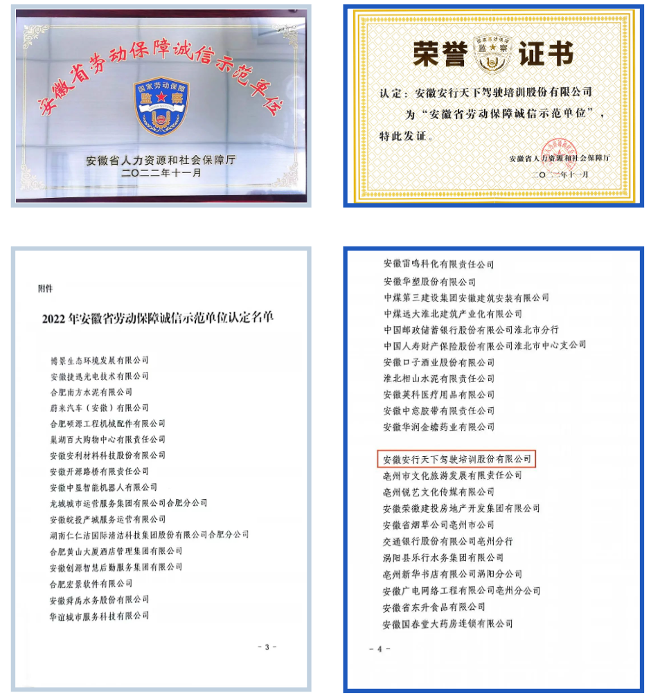 為加強(qiáng)勞動(dòng)用工領(lǐng)域誠(chéng)信體系建設(shè),充分發(fā)揮信用監(jiān)管聯(lián)合獎(jiǎng)懲效用,省人力資源社會(huì)保障廳在全省組織開展2022年勞動(dòng)保障守法誠(chéng)信等級(jí)評(píng)價(jià)工作,安行天下駕校通過認(rèn)定,被授予“2022年安徽省勞動(dòng)保障誠(chéng)信示范單位”榮譽(yù)。