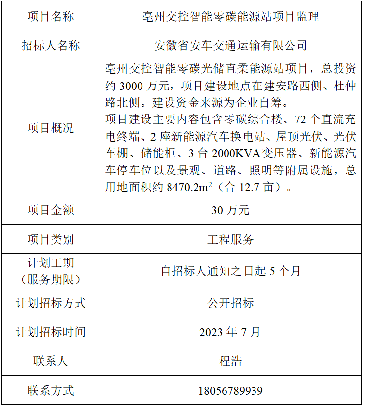 為便于潛在投標(biāo)人及時(shí)了解招標(biāo)信息,現(xiàn)將安徽省安車交通運(yùn)輸有限公司(招標(biāo)人名稱)的招標(biāo)計(jì)劃發(fā)布如下:
