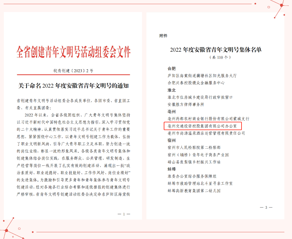 近日,安徽省創(chuàng)建青年文明號(hào)活動(dòng)組委會(huì)頒布了《關(guān)于命名 2022 年度安徽省青年文明號(hào)的通知》(皖青創(chuàng)建〔2023〕2 號(hào)),集團(tuán)辦公室榮獲2022年度安徽省“青年文明號(hào)”榮譽(yù)稱號(hào)。