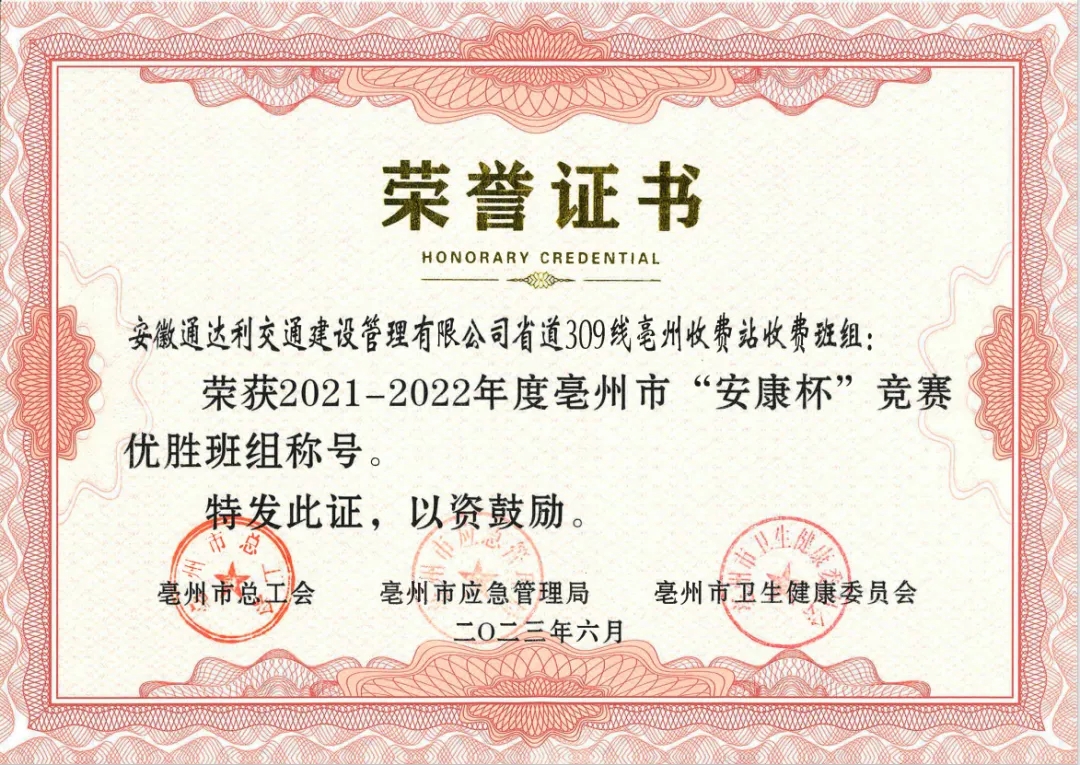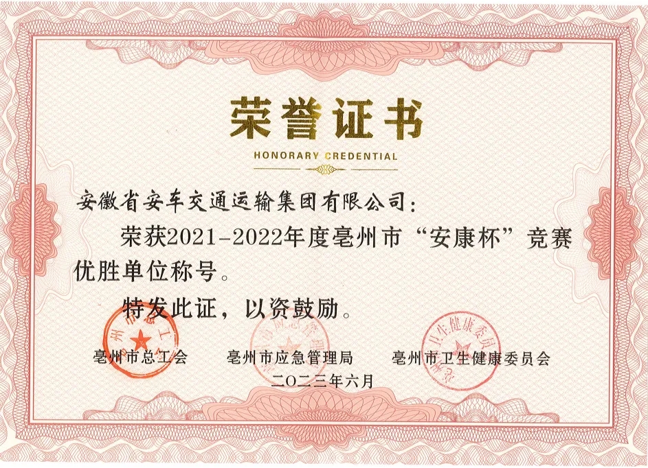 近日,市總工會、市應(yīng)急管理局、市衛(wèi)生健康委員會聯(lián)合下發(fā)《關(guān)于表彰2021-2022年度全市“安康杯”競賽先進(jìn)集體和先進(jìn)個人的決定》(亳工〔2023〕55號),表彰在2021-2022年度全市“安康杯”競賽活動中取得優(yōu)異成績的集體和個人。其中,交控集團(tuán)下屬單位、班組榮獲優(yōu)勝單位、優(yōu)勝班組、優(yōu)秀個人等多項榮譽(yù)。