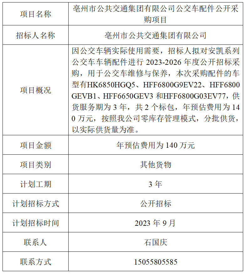 為便于潛在投標(biāo)人及時(shí)了解招標(biāo)信息,現(xiàn)將亳州市公共交通集團(tuán)有限公司(招標(biāo)人名稱)的招標(biāo)計(jì)劃發(fā)布如下: