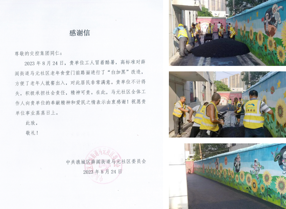 在湯王大道白加黑項目施工過程中,通康公司針對馬元社區(qū)老年食堂門前道路不平、存在坑槽等問題,積極與馬元社區(qū)溝通,組織施工人員對食堂門前道路進(jìn)行瀝青面層攤鋪施工,消除安全隱患。