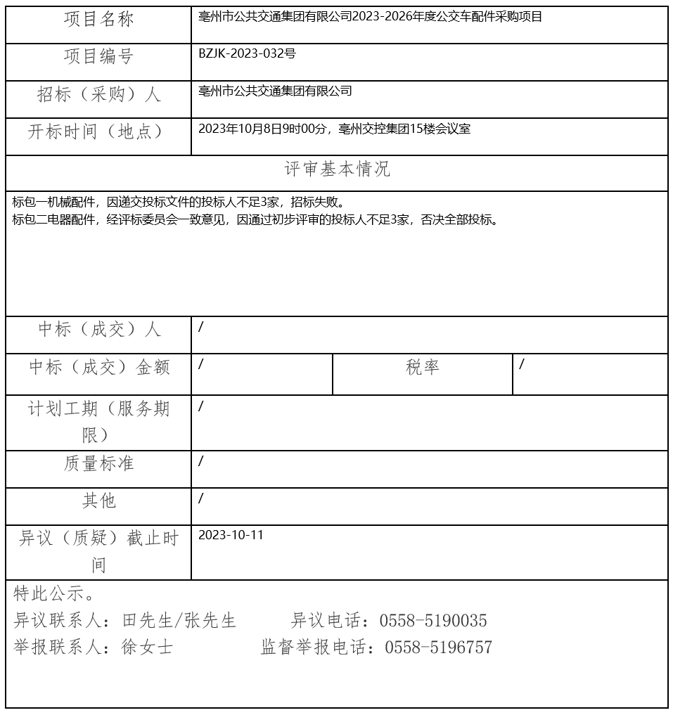 亳州市公共交通集團(tuán)有限公司2023-2026年度公交車(chē)配件采購(gòu)項(xiàng)目中標(biāo)(成交)結(jié)果公示