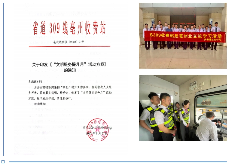 制定《文明服務(wù)提升月活動方案》,以開展服務(wù)提升月活動為契機,加強文明優(yōu)質(zhì)服務(wù)的長效機制和長期落實,開展文明服務(wù)專題培訓(xùn),赴亳州北高速收費站開展業(yè)務(wù)交流學(xué)習(xí),不斷提升服務(wù)標(biāo)準(zhǔn)化水平。