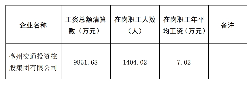 根據(jù)《亳州市市屬企業(yè)工資總額管理暫行辦法》(亳國資管〔2019〕37號)有關(guān)規(guī)定,現(xiàn)將亳州交控集團(tuán)2021年度工資分配信息披露如下: