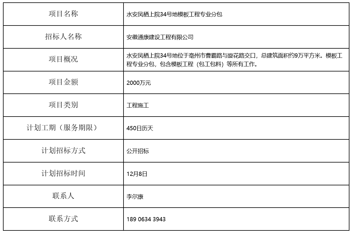 水安鳳棲上院34號地模板工程專業(yè)分包招標(biāo)計劃