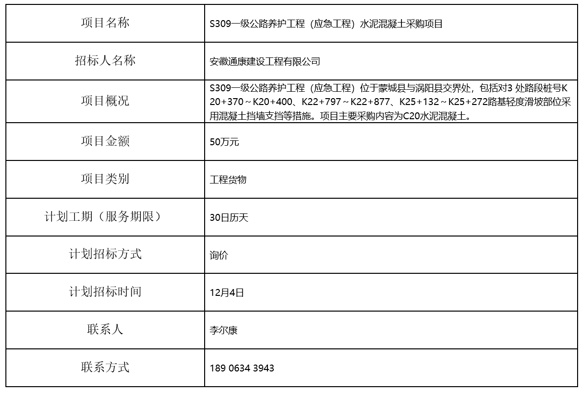 S309一級(jí)公路養(yǎng)護(hù)工程(應(yīng)急工程)水泥混凝土采購(gòu)項(xiàng)目招標(biāo)計(jì)劃