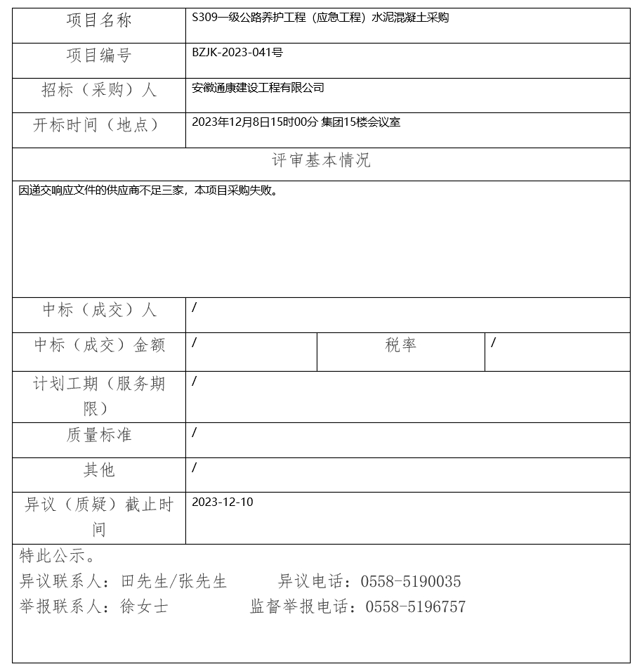 S309一級公路養(yǎng)護(hù)工程(應(yīng)急工程)水泥混凝土采購中標(biāo)(成交)結(jié)果公示