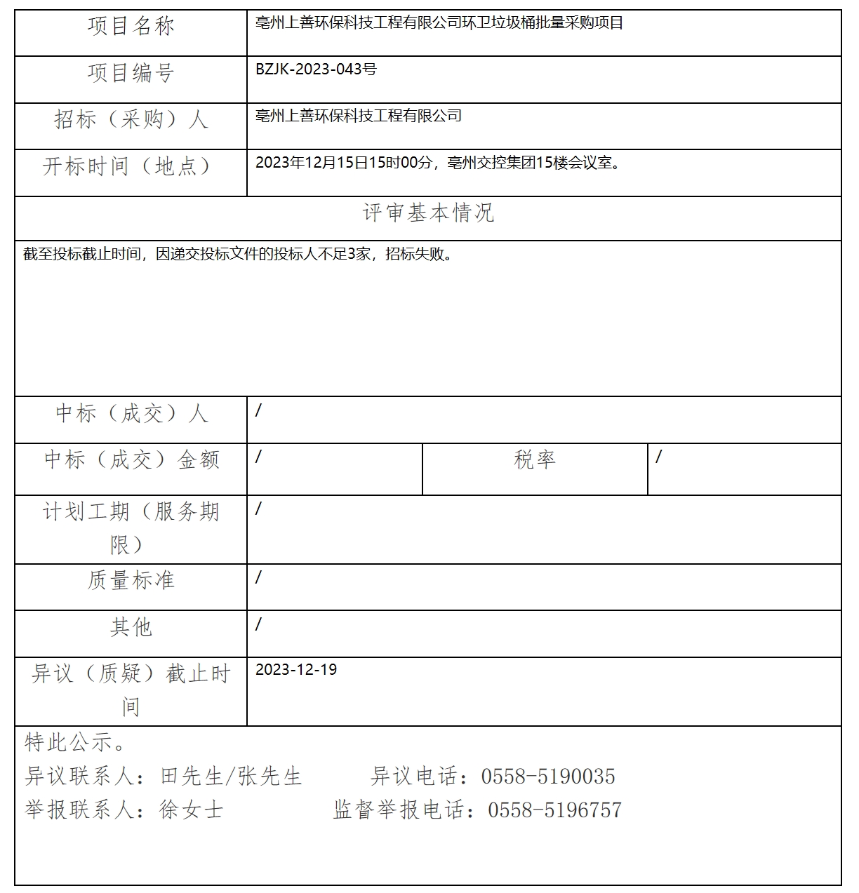 亳州上善環(huán)保科技工程有限公司環(huán)衛(wèi)垃圾桶批量采購(gòu)項(xiàng)目中標(biāo)(成交)結(jié)果公示