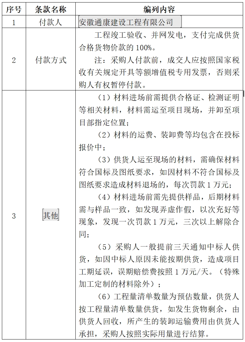 (二)采購范圍:亳州新能源發(fā)展有限公司亳州中心汽車站菜市場430kW分布式光伏發(fā)電項(xiàng)目中支撐電纜槽、鑄鐵井蓋井座、角鋼、扁鐵、鍍鋅鋼管、鍍鋅鋼管接頭、鍍鋅鋼管卡子等材料供應(yīng),及后期設(shè)計(jì)變更、業(yè)主及招標(biāo)人要求增加、工程聯(lián)系單等要求的增加的材料。