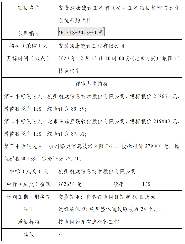 安徽通康建設(shè)工程有限公司工程項(xiàng)目管理信息化系統(tǒng)采購(gòu)項(xiàng)目中標(biāo)(成交)結(jié)果公示