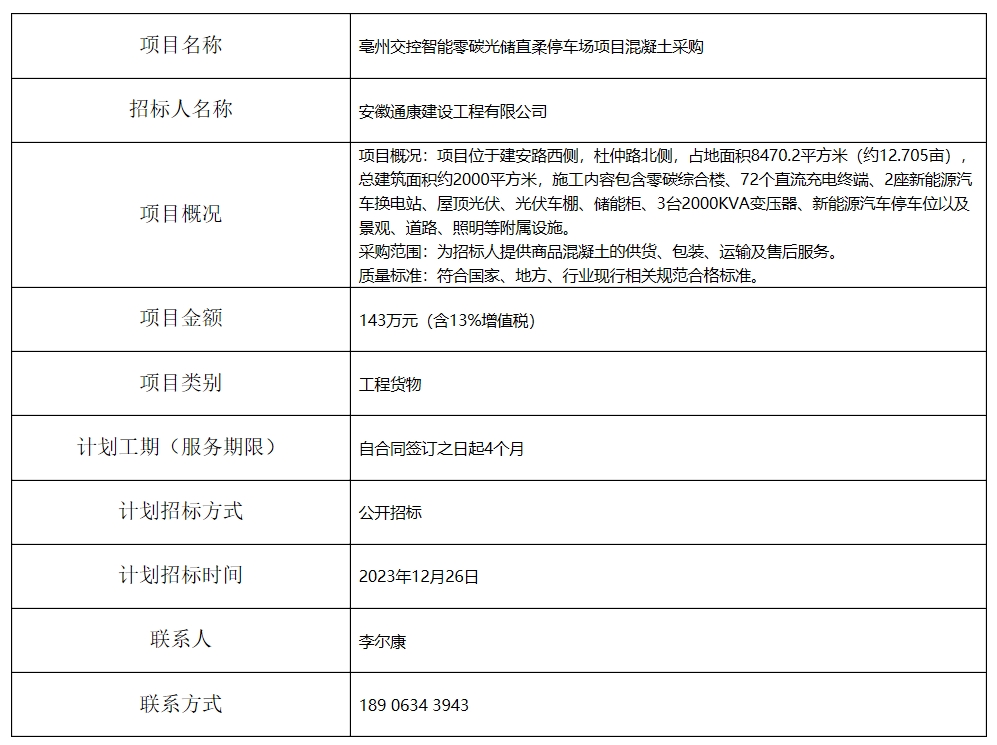 亳州交控智能零碳光儲(chǔ)直柔停車場(chǎng)項(xiàng)目混凝土采購(gòu)招標(biāo)計(jì)劃
