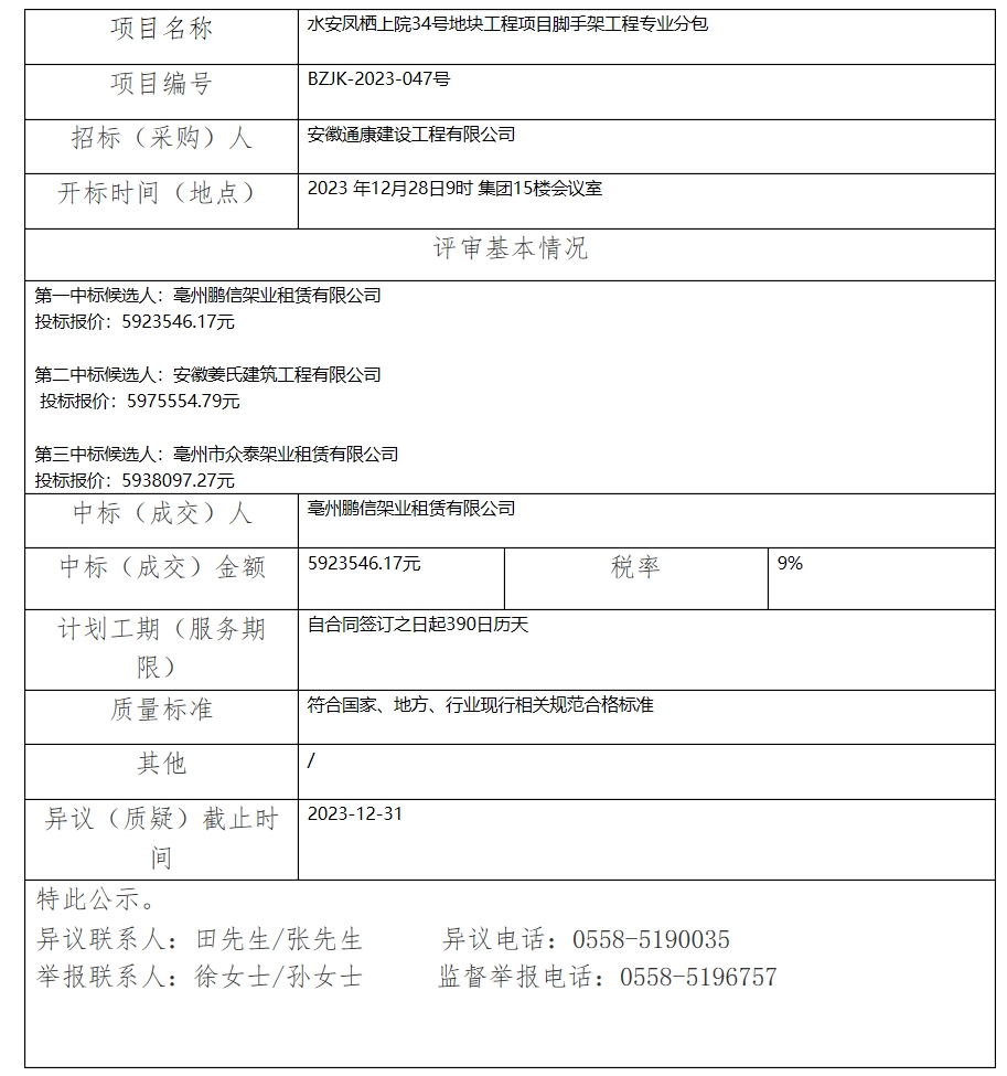 水安鳳棲上院34號地塊工程項(xiàng)目腳手架工程專業(yè)分包中標(biāo)(成交)結(jié)果公示