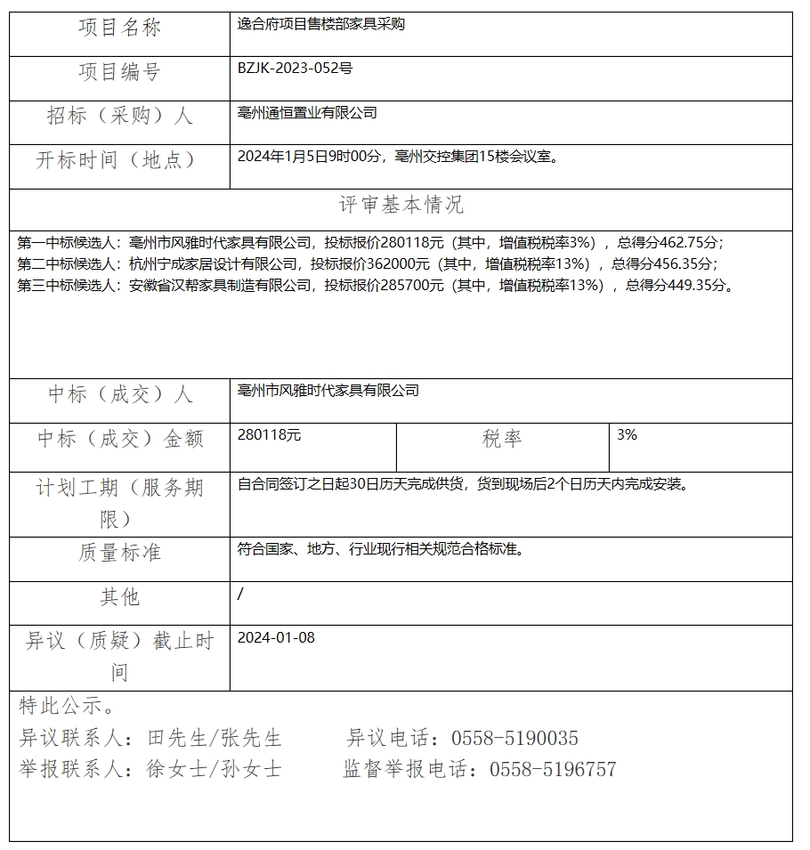 逸合府項(xiàng)目售樓部家具采購中標(biāo)(成交)結(jié)果公示