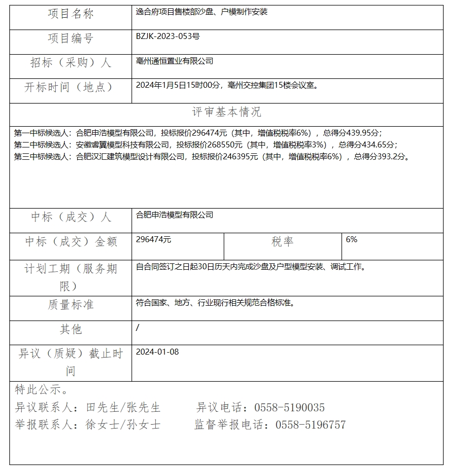 逸合府項目售樓部沙盤、戶模制作安裝中標(biāo)(成交)結(jié)果公示