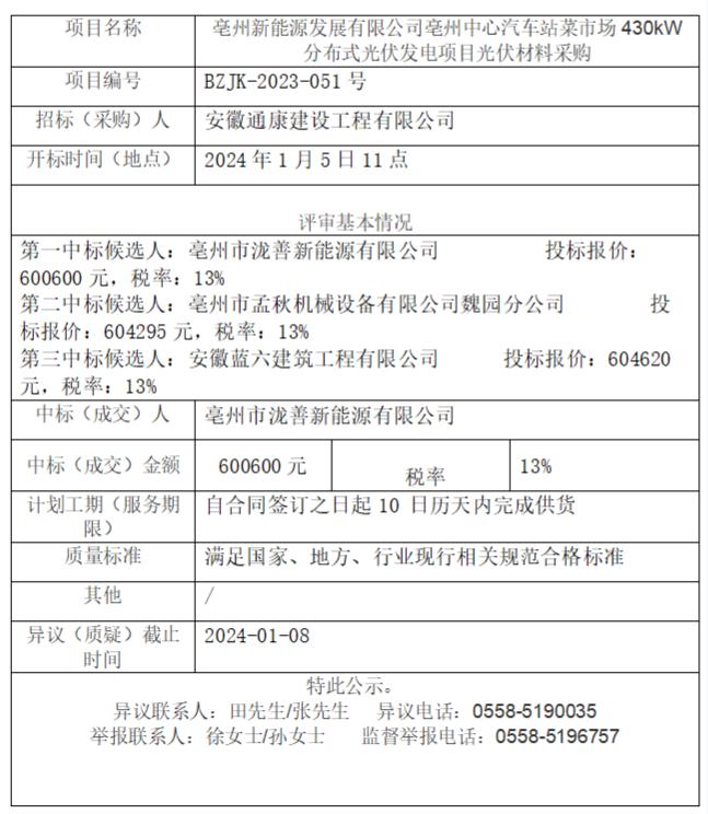 亳州新能源發(fā)展有限公司亳州中心汽車站菜市場(chǎng)430kW分布式光伏發(fā)電項(xiàng)目光伏材料采購(gòu)中標(biāo)(成交)結(jié)果公示