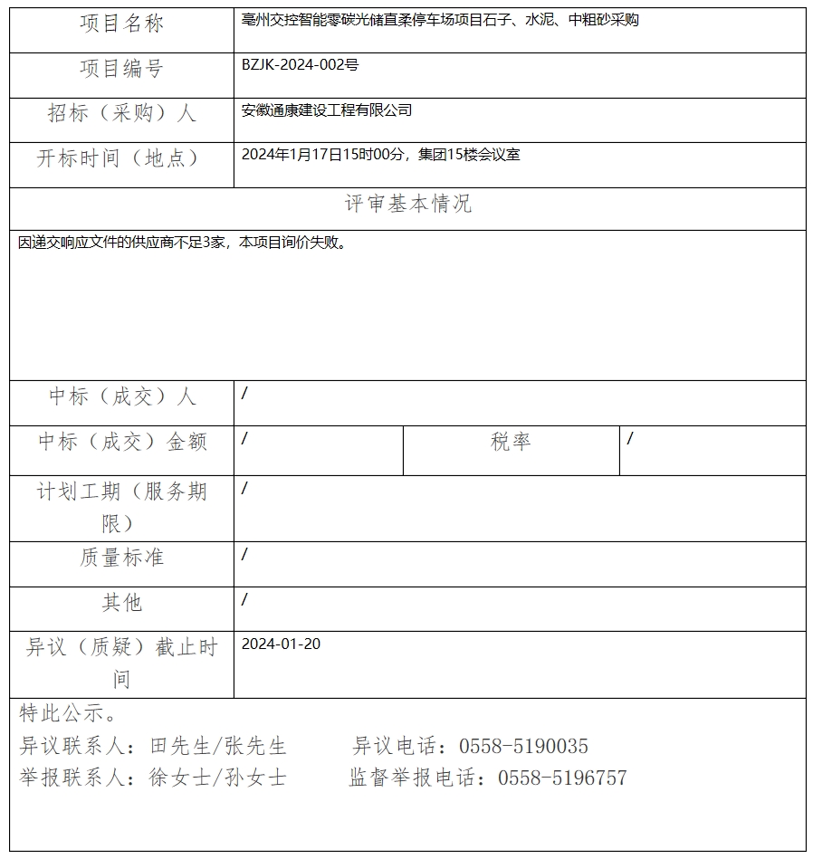 亳州交控智能零碳光儲(chǔ)直柔停車場項(xiàng)目石子、水泥、中粗砂采購中標(biāo)(成交)結(jié)果公示