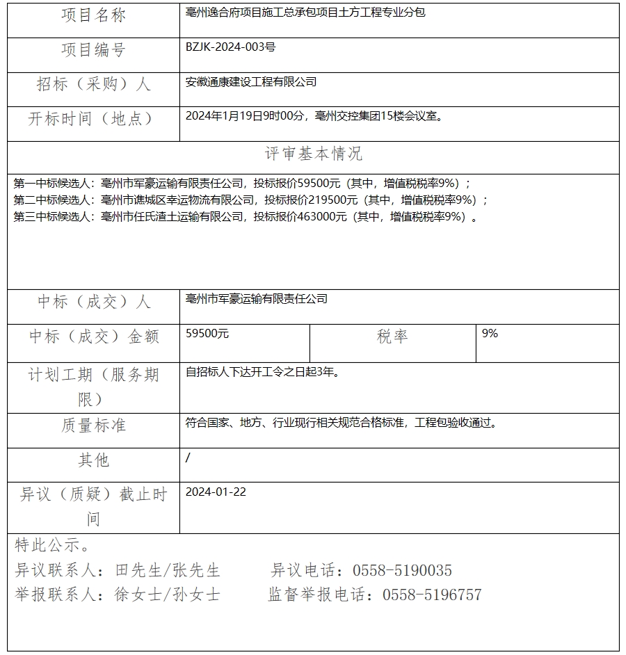 亳州逸合府項目施工總承包項目土方工程專業(yè)分包中標(成交)結果公示