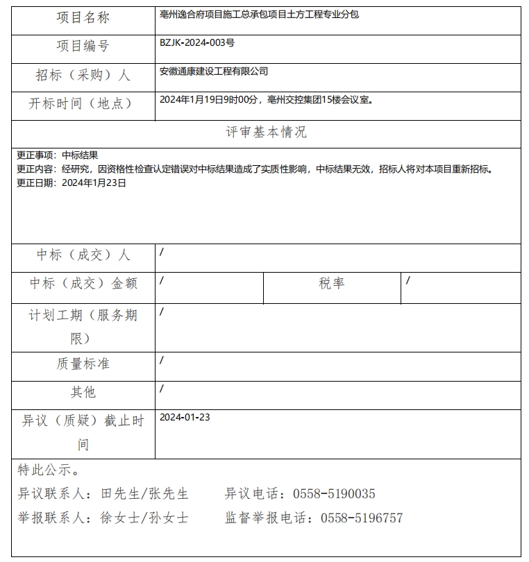 亳州逸合府項目施工總承包項目土方工程專業(yè)分包中標結(jié)果更正公示