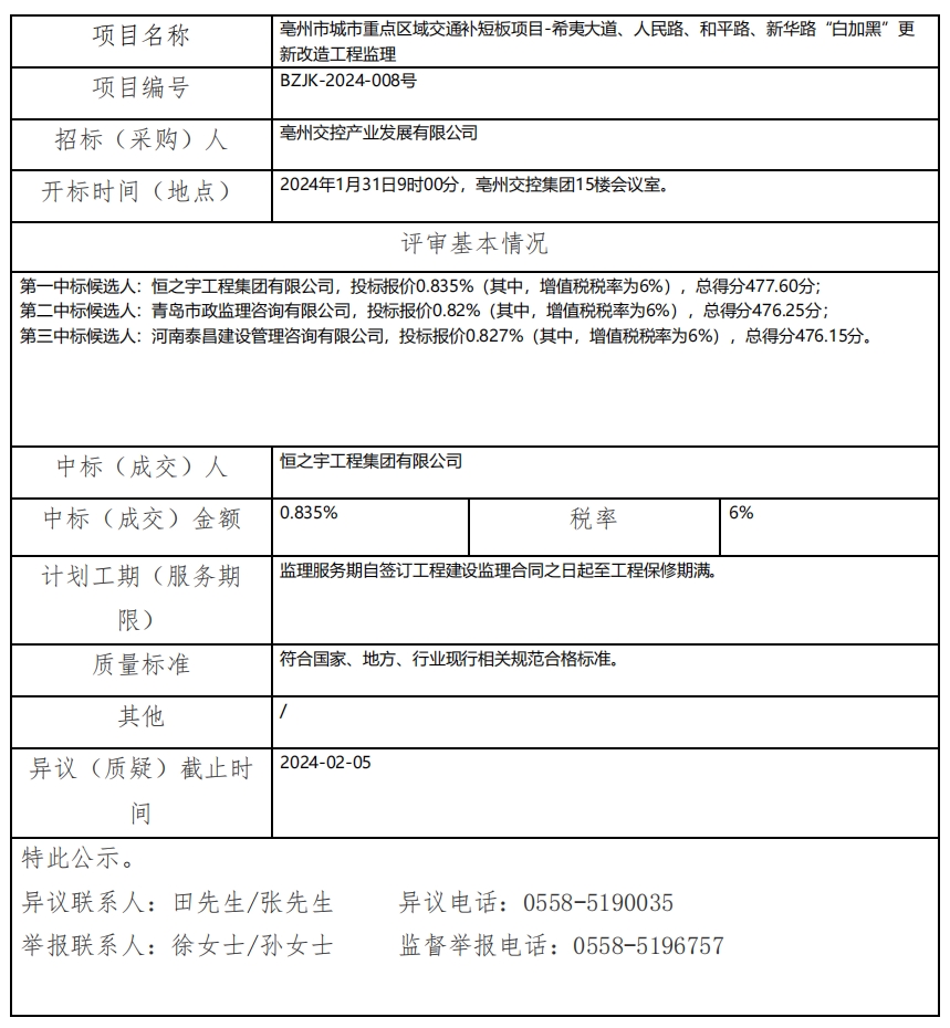 亳州市城市重點(diǎn)區(qū)域交通補(bǔ)短板項(xiàng)目-希夷大道、人民路、和平路、新華路“白加黑”更新改造工程監(jiān)理中標(biāo)(成交)結(jié)果公示