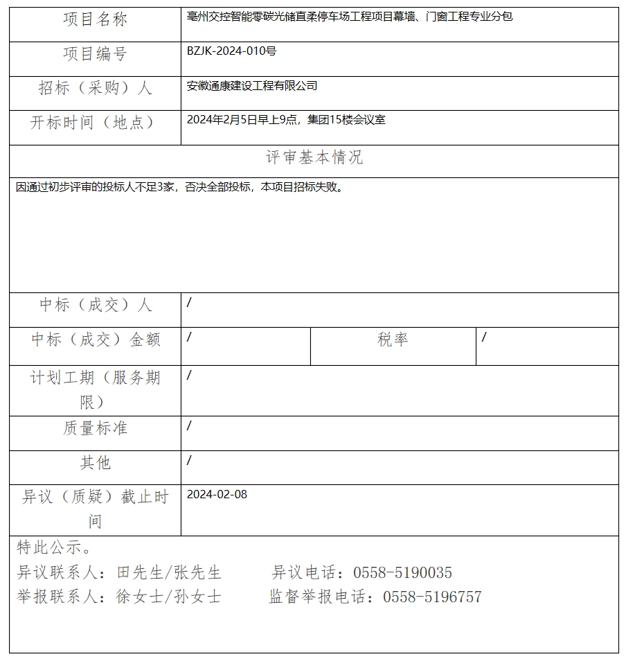 亳州交控智能零碳光儲(chǔ)直柔停車場(chǎng)工程項(xiàng)目幕墻、門窗工程專業(yè)分包中標(biāo)(成交)結(jié)果公示
