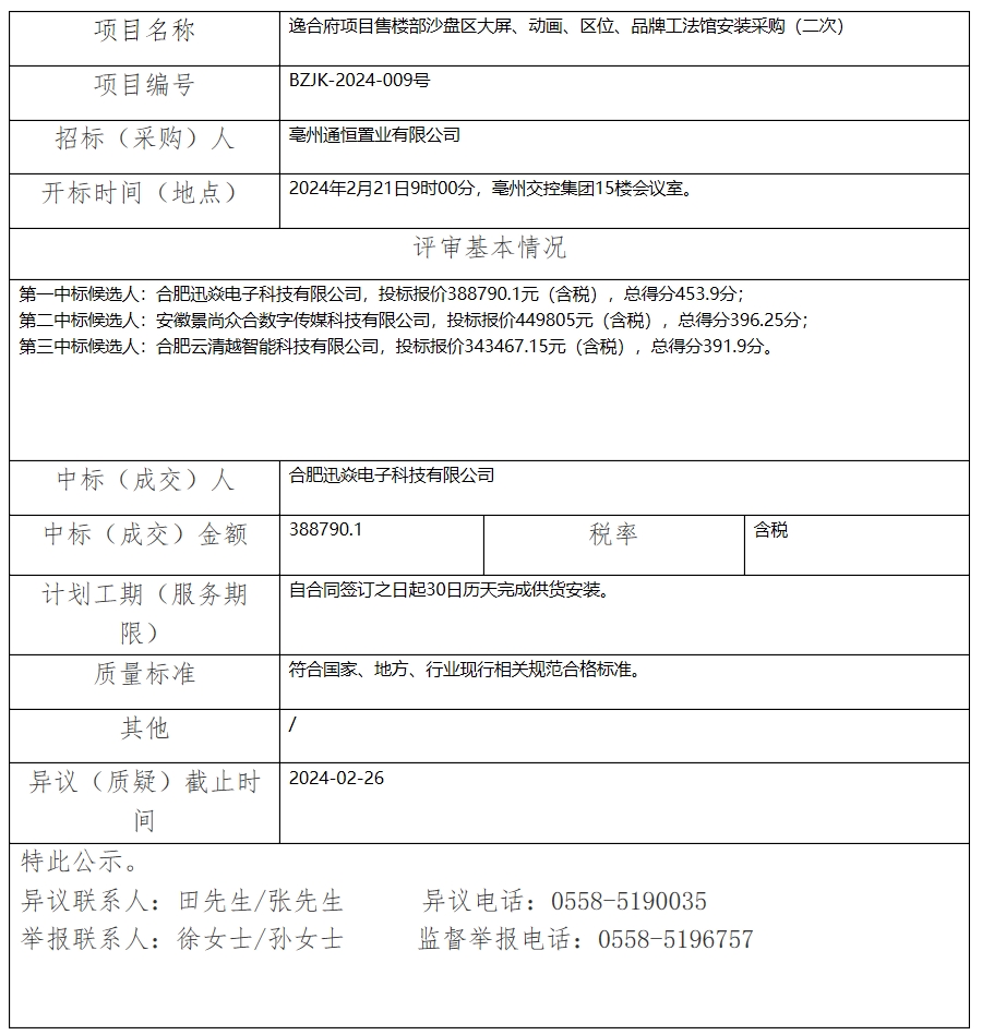 逸合府項(xiàng)目售樓部沙盤區(qū)大屏、動畫、區(qū)位、品牌工法館安裝采購(二次)中標(biāo)(成交)結(jié)果公示
