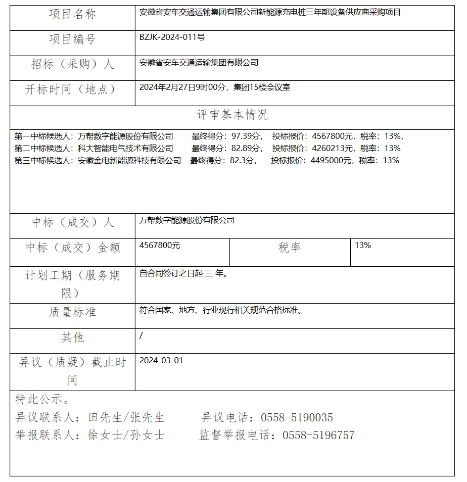 安徽省安車交通運(yùn)輸集團(tuán)有限公司新能源充電樁三年期設(shè)備供應(yīng)商采購項(xiàng)目中標(biāo)(成交)結(jié)果公示