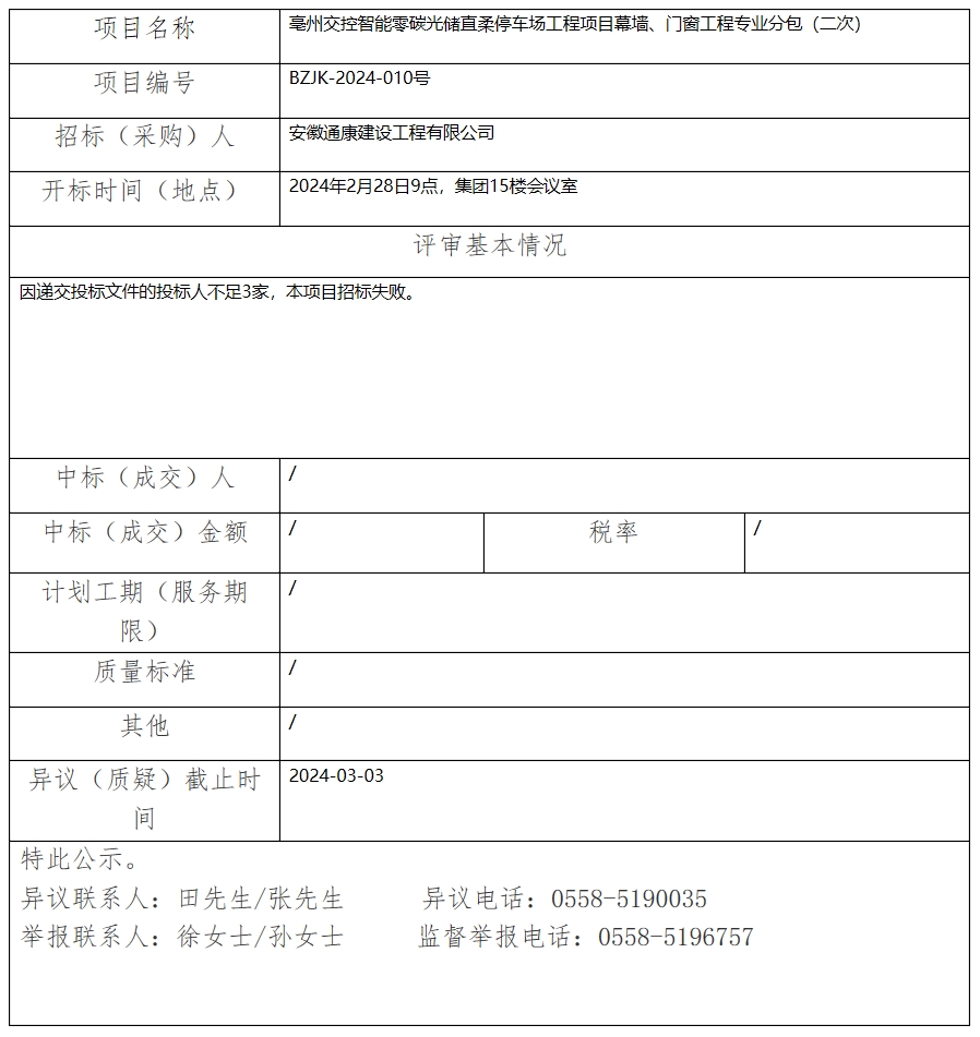 亳州交控智能零碳光儲直柔停車場工程項目幕墻、門窗工程專業(yè)分包(二次)中標(biāo)(成交)結(jié)果公示