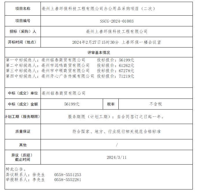 亳州上善環(huán)??萍脊こ逃邢薰巨k公用品采購 項目(二次)中標結果公示