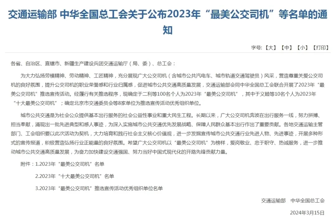 近日,交通運(yùn)輸部、中華全國總工會(huì)聯(lián)合發(fā)布2023年“最美公交司機(jī)”等名單,亳州公交駕駛員高團(tuán)結(jié)獲評(píng)“最美公交司機(jī)”。