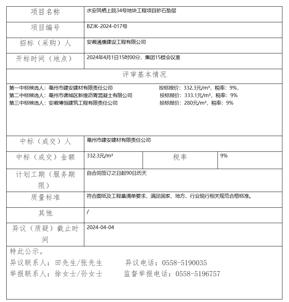 水安鳳棲上院34號地塊工程項目砂石墊層中標(成交)結果公示