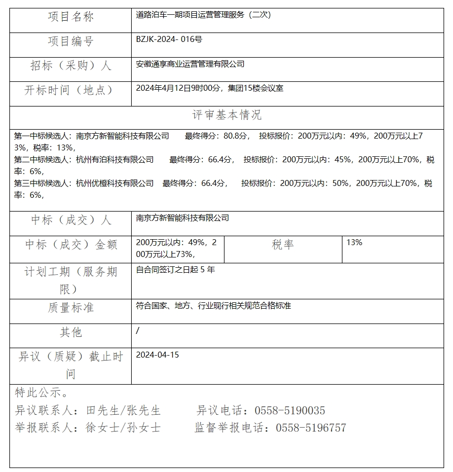 道路泊車一期項目運(yùn)營管理服務(wù)(二次)中標(biāo)(成交)結(jié)果公示