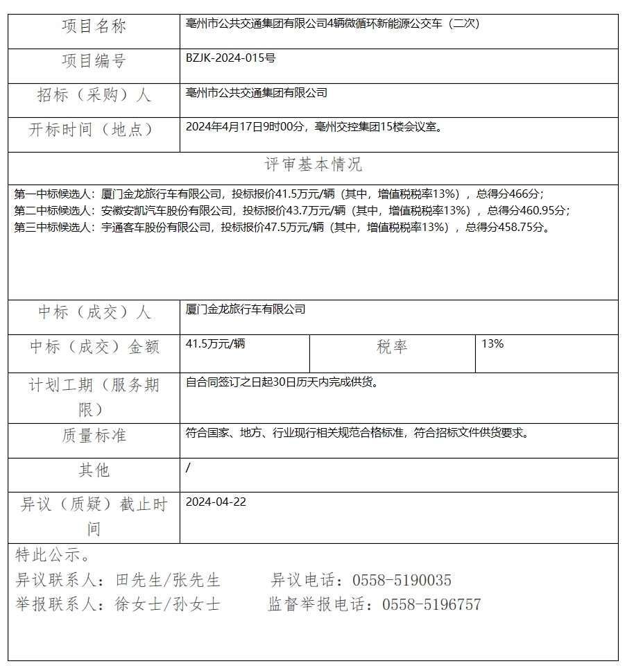 亳州市公共交通集團有限公司4輛微循環(huán)新能源公交車(二次)中標(成交)結果公示