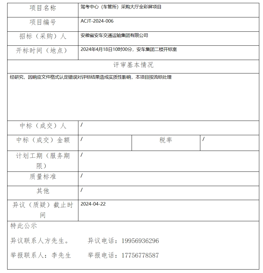 駕考中心(車管所)采購大廳全彩屏項(xiàng)目中標(biāo)(成交)結(jié)果公示