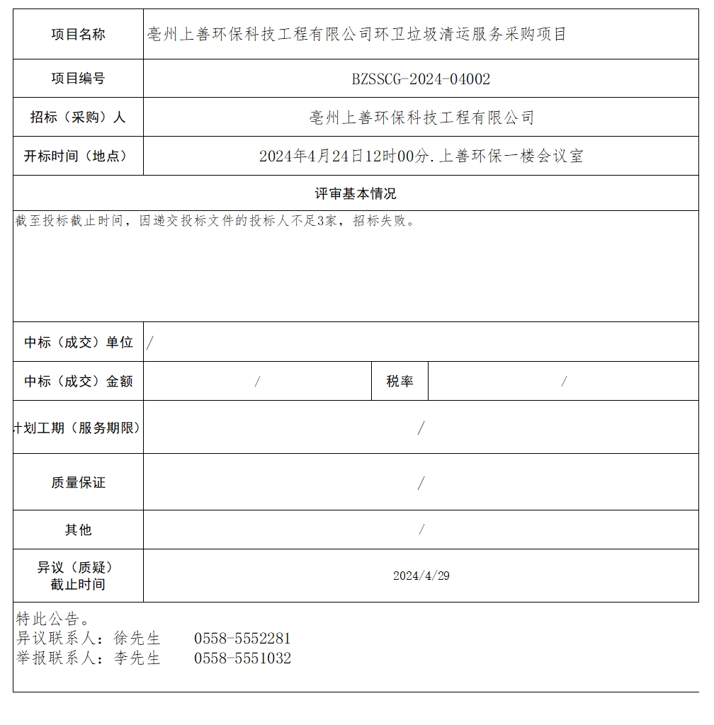 亳州上善環(huán)??萍脊こ逃邢薰经h(huán)衛(wèi)垃圾清運(yùn)服務(wù)采購(gòu)項(xiàng)目中標(biāo)結(jié)果公示