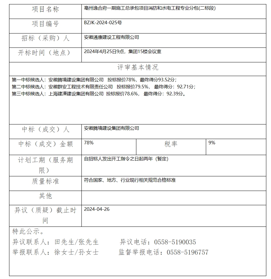 亳州逸合府一期施工總承包項目消防和水電工程專業(yè)分包(二標段)中標(成交)結果公示